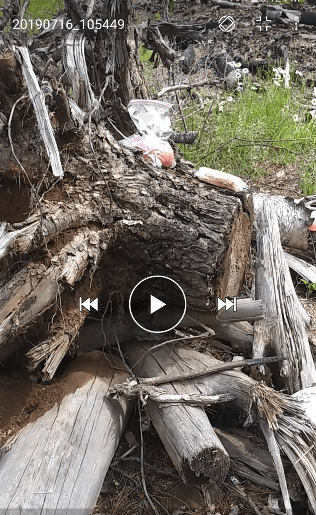 We found a new food gifting site a few miles away, down a long unused forestry road. Thick brush, lots of trees, ravines, and lots of bugs! We found a spot about half way down the road. We set up the sandwich, cookies and apples (this time out of the bags) on a huge rock there. We set up a trail cam (across the road) from the gifts and also set up an audio recorder (with external mike) a little farther down the road, more at a ravine area. This area looked promising! Time was 4:35 p.m.